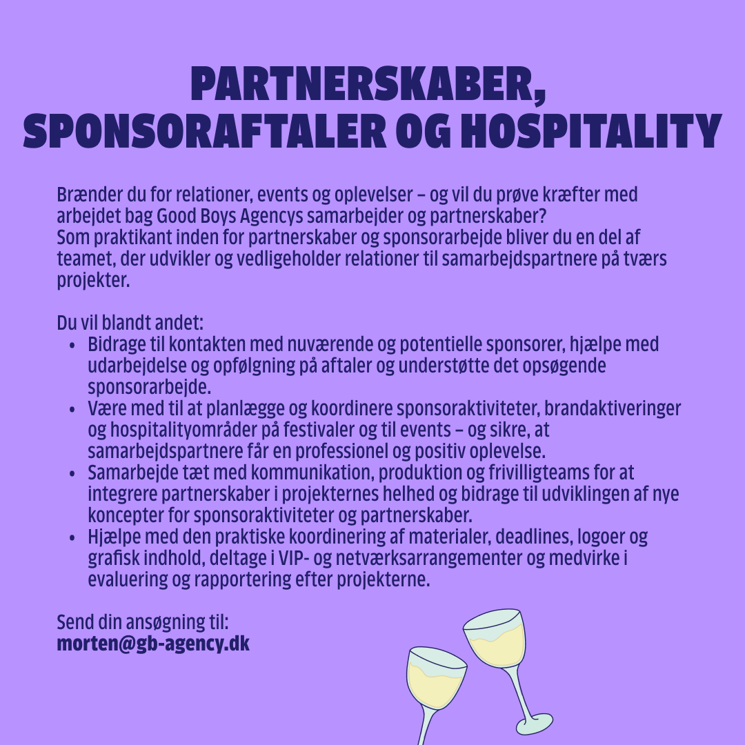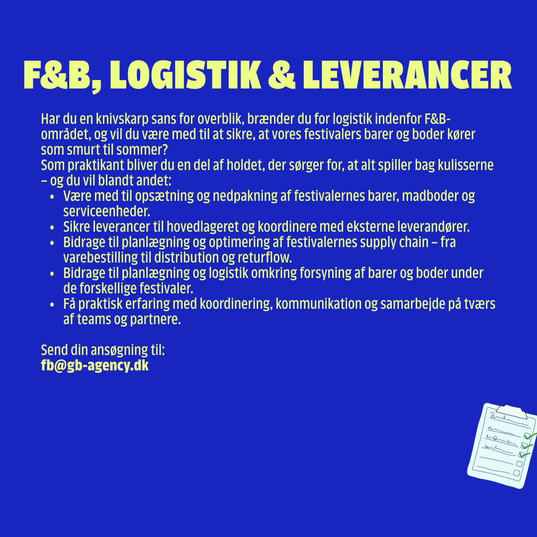 - F&B, Logistik og Leverancer: (Kontakt: fb@gb-agency.dk)